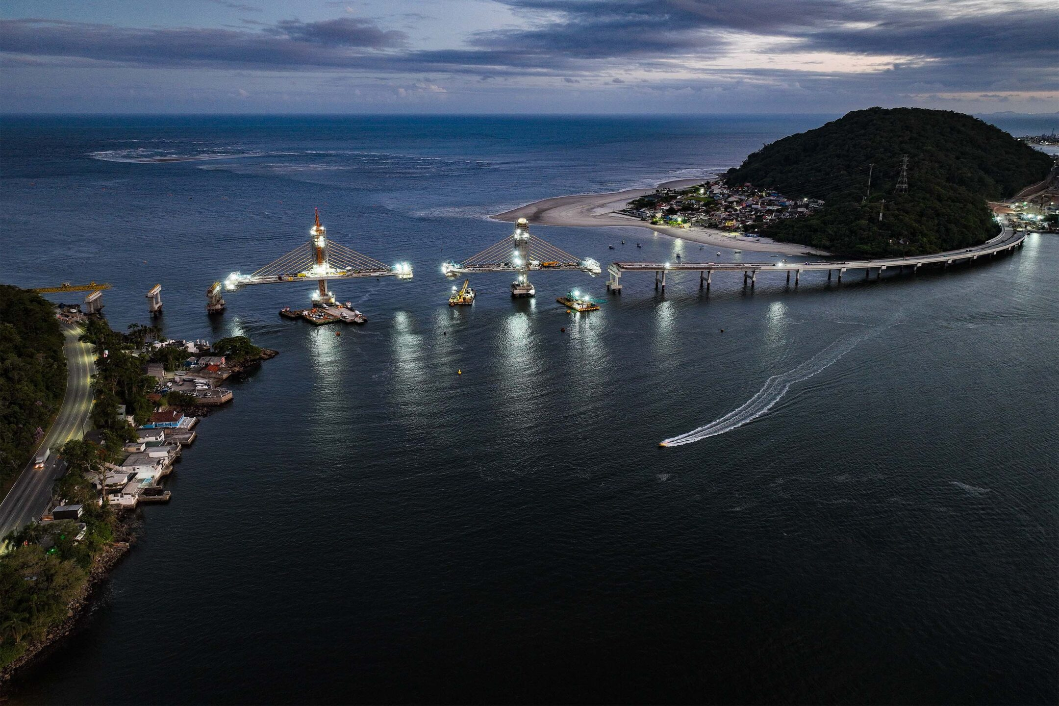 OBRA EMBLEMÁTICA – As obras da Ponte de Guaratuba alcançaram 85% de execução até o começo de dezembro. Com 1.240 metros de extensão e investimento superior a R$ 400 milhões, a estrutura tem previsão de conclusão em abril de 2026 e vai substituir definitivamente a travessia por ferry-boat, garantindo mais mobilidade, segurança e integração ao Litoral do Paraná.