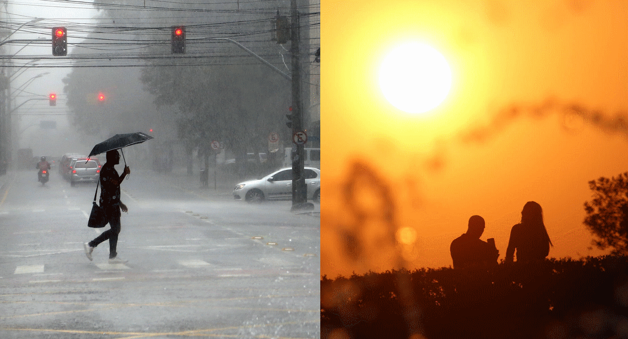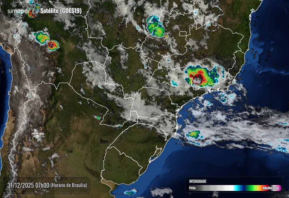 Uma frente fria avança na altura do Uruguai neste sábado, mas se afasta em direção ao oceano. No Paraná, o sol predomina e as taxas de umidade diminuem. Apesar disso, ainda há possibilidade de chuva isolada entre a tarde e à noite. Precipitações ocorrem especialmente próximo a encostas de serras e vales de rios, regiões onde há maior disponibilidade de umidade. As temperaturas se elevam bastante em todo estado, com máximas previstas acima dos 35°C entre o sudoeste, oeste, noroeste e o norte paranaense.