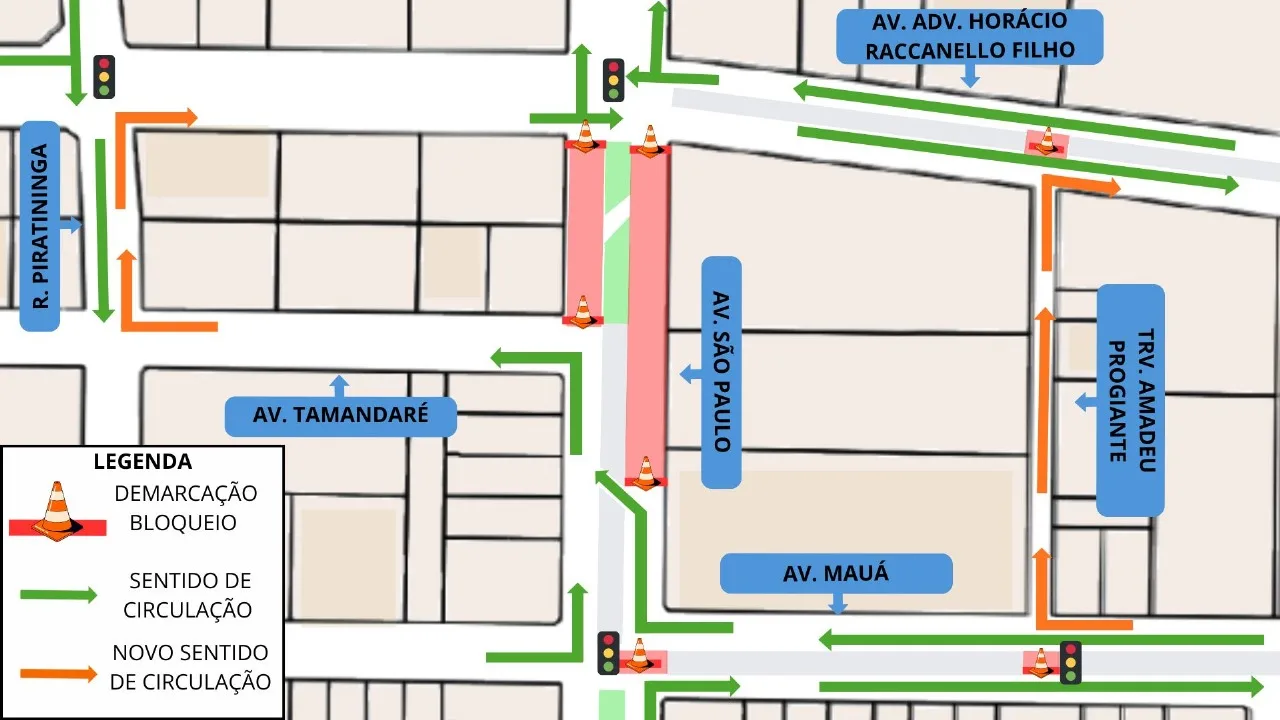 -Fica proibido o fluxo de veículos nas duas pistas da Avenida São Paulo, no trecho entre as avenidas Mauá e Horácio Raccanello, sendo permitidas apenas conversões à direita na Avenida Mauá e à esquerda na Avenida Tamandaré;